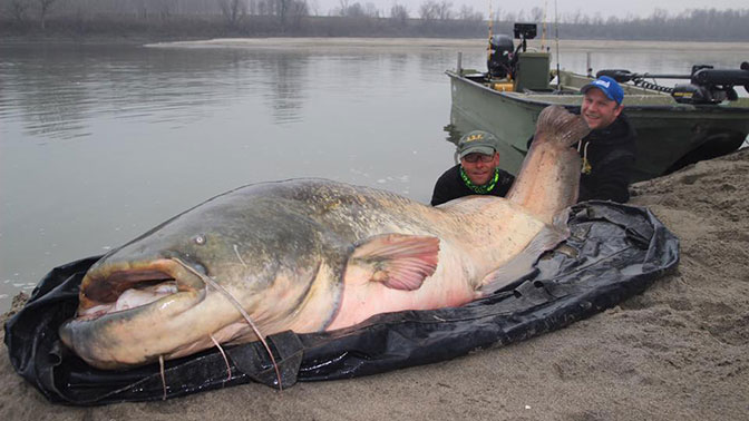 В самой большой реке Италии - По - рыбаки поймали огромного сома, больше похожего на подводного монстра. Вес рыбины по меньшей мере 130 килограммов, а длина порядка двух метров сообщает The Sun. Как рассказал Бенджамин Грундер, на чей крючок и попался сом, когда он пытался достать «нечто» из воды, то сначала подумал, что его снасти просто зацепились за корни дерева на дне реки.